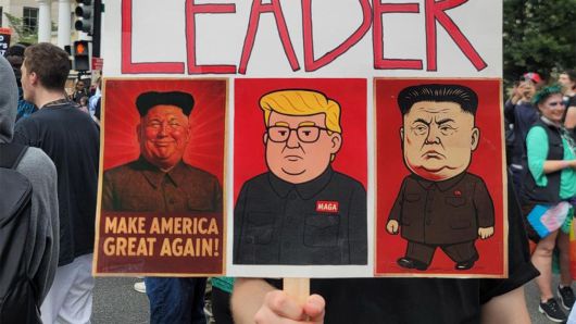 ▲ 14일(현지시간) 워싱턴 DC에서 열린 미 육군 창설 250주년 기념 열병식을 앞두고 백악관 인근 라파예트 광장에서 반(反)트럼프 시위가 열렸다. 한 시위 참가자가 트럼프 대통령과 김정은 북한 국무위원장의 얼굴을 '합성'한 만화가 그려진 피켓을 들고 있다.