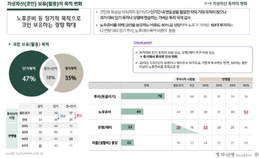 윤선영 하나금융연구소 연구위원은 “이미 가상자산은 투자자들의 포트폴리오 내에서 주요한 역할을 하며 더욱 대중화될 전망이다. 이에 가상자산의 법적 제도화와 기존 금융권의 역할 확대를 기대하는 투자자들의 바람이 크다”면서 “가상자산 투자 확대는 은행에게 기회일 수도 또는 위기일 수도 있다. 가상자산 기반 금융상품의 다양화, 통합적인 투자 관리의 고도화, 가상자산 업계와의 협업 등 투자 생태계 확장에 대비할 선제적 준비가 필요하다”고 말했다.