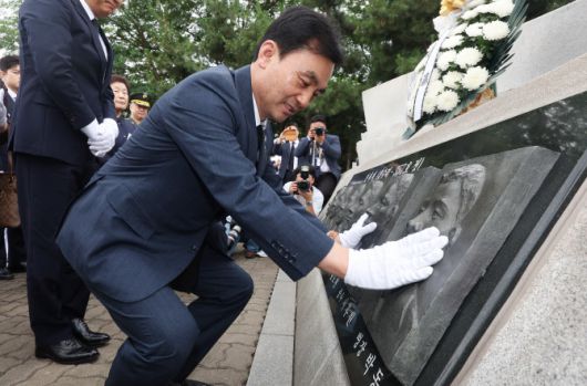 29일 경기도 평택시 해군 제2함대사령부에서 열린 ‘제2연평해전 승전 23주년 기념식’에서 안규백 국방부 장관 후보자가 해전 영웅들의 얼굴 부조상을 어루만지고 있다. [연합뉴스 제공] |