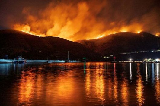 24일(현지시각) 그리스 키오스 섬 리티 항구에서 바라본 산불. 키오스/EPA 연합뉴스 |