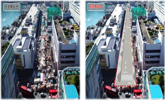 자갈치아지매시장 도로 확장 전후 조감도. 부산세 제공 |