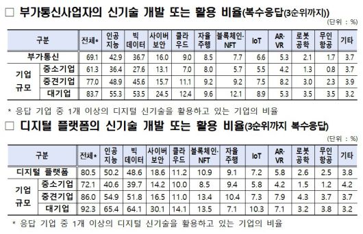 기업 규모가 클수록 인공지능을 활용하거나 개발하는 비율이 높았다. 디지털 플랫폼 기업 중 인공지능을 활용하는 대기업의 65.4%가 인공지능을 활용했다. 중견기업의 활용 비율은 54.9%, 중소기업은 40.6%였다. 전체 부가통신사업자 중 대기업의 인공지능 활용 비율은 55.3%, 중견기업 48.9%, 중소기업 36.4%였다.