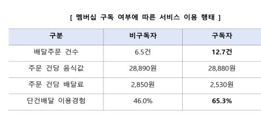 다만, 건당 음식값은 구독자(28,880원)와 비구독자(28,890원)가 유사해 멤버십 이용자들이 주로 배달비 절감 효과를 체감하는 것으로 분석됐다.