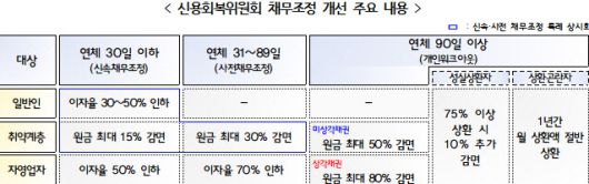 채무자 특성별 맞춤형 채무조정도 강화된다. 장기연체( 90일 이상 연체)로 인해 채무조정을 신청했으나 상환능력이 매우 열악한 취약계층(기초생활수급자, 장애의 정도가 심한 장애인 및 70세 이상 고령자)의 미상각채권에 대한 원금감면 수준이 최대 50%까지 확대된다. 기초생활수급자 등 취약계층은 일반 채무자에 비해 상환능력이 현저히 낮음에도 일반 채무자와 동일한 수준의 감면 기준(최대 30%)이 적용됐으나, 금번 제도개선으로 한층 강화된 채무조정 지원을 받을 수 있게 된 것이다.