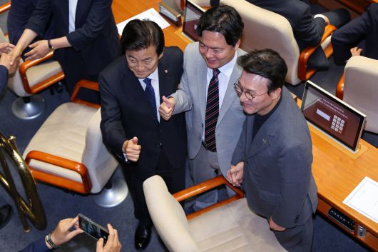 김현정(가운데) 더불어민주당 원내대변인이 지난 26일 국회 본회의장에서 이재명 대통령의 시정연설에 앞서 김민석(오른쪽) 국무총리 후보자, 정동영 통일부 장관 후보자와 기념 사진을 찍고 있다. /남강호 기자 |
