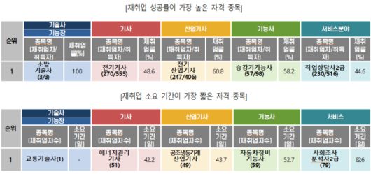 자격별로 보면, 응시자 수가 50명 이상인 종목 중 재취업률이 가장 높았던 자격은 기사 분야에서는 전기기사(48.6%), 산업기사 분야에서는 전기산업기사(60.8%), 기능사 중에서는 승강기기능사(58.2%)였다. 서비스 직종에서는 직업상담사 2급이 44.6%로 가장 높았다.