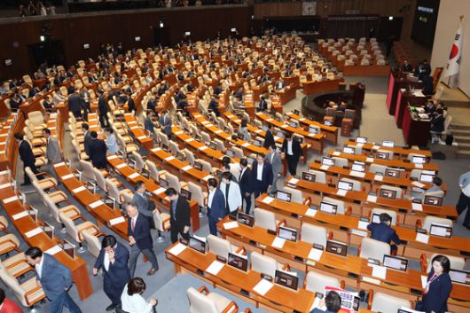 국민의힘 의원들이 27일 국회 본회의에서 여당 주도의 법제사법위원장 등 상임위원장 선출에 반대하며 퇴장하고 있다. 연합뉴스 |