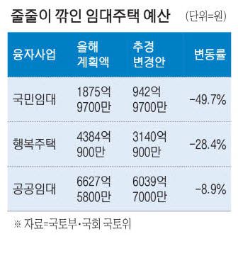 청년·신혼부부를 위한 공공임대주택인 행복주택의 융자사업 예산도 마찬가지다. 원래 올해 사업 예산이 4384억900만원으로 책정됐지만 이번 추경을 통해 3140억900만원으로 조정됐다. 예산이 1244억원(28.4%)이나 깎였다. 착공 물량이 4218가구에서 2657가구, 준공 물량이 1만3185가구에서 8307가구로 줄어들 것으로 예상됐기 때문이다.