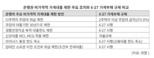 은행들은 급작스러운 주담대와 신용대출, 생활안정자금 한도 규제 등을 대책 시행일인 지난 28일부터 은행 내부 대출시스템에 바로 적용하기 위해 비대면 주담대·신용대출을 일시 중단하는 등 비상이 걸렸다.