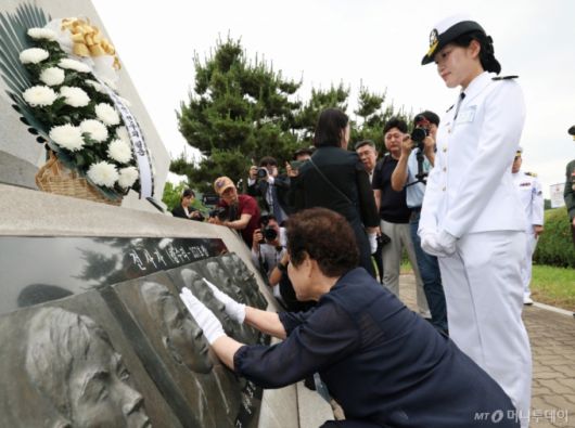 [평택=뉴시스] 황준선 기자 = 29일 경기 평택시 해군 제2함대사령부에서 열린 '제2연평해전 승전 23주년 기념식'에서 고(故) 조천형 상사의 딸 조시은 소위가 추모를 하고 있다. (공동취재) 2025.06.29. hwang@newsis.com /사진= |