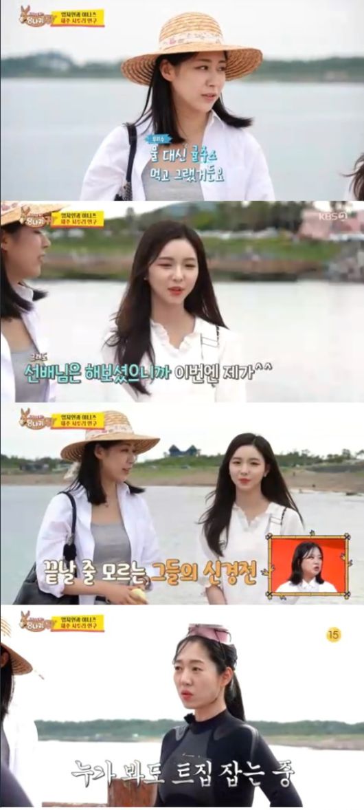 제주 출신인 홍주연은 "저는 물 대신 귤 주스를 먹었다"고 했다. 정은혜는 "선배님 해보셨으니까 이번에는 제가 하는 게 낫지 않으냐"고 맞섰다.