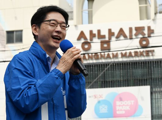 김경수 전 경남지사가 지난 5월 경남 창원에서 이재명 당시 대선후보 유세에서 발언하고 있다. 박민규 선임기자 |