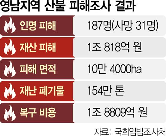 영남 일대를 덮친 ‘괴물 산불’로부터 100일이 지났지만 지역 주민들의 생계는 여전히 잿더미 위에 놓여 있었다. 29일 국회입법조사처와 중앙재난안전대책본부 등에 따르면 3월 21일부터 10일간 8개 시군에서 동시다발적으로 발생한 산불로 사망자 31명을 포함해 187명의 인명 피해가 생겼다.