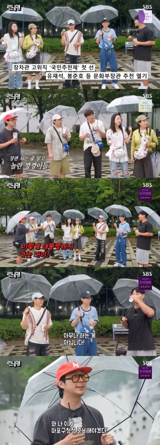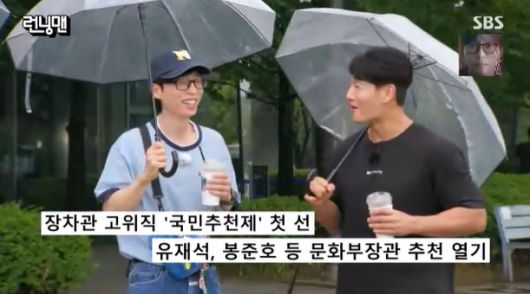 이날 본격적인 레이스를 펼치기에 앞서 김종국은 유재석을 향해 “문화부장관 추천을 받았더라”고 말했다.