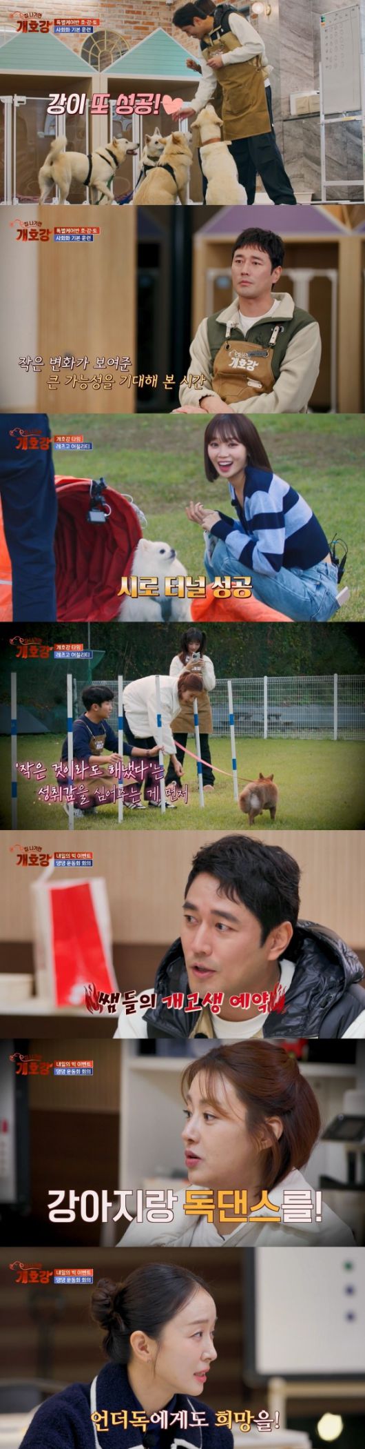 공격성이 전혀 없는 호두는 한나의 행동을 모방하며 ‘앉기’ 교육도 수월하게 성공했다. 뒤이어 온 강이 또한 한나&호두와 함께 자연스럽게 합사했다. 그러나 가장 경계심이 높았던 토리는 극도의 흥분 상태로 제어 불가 상태가 됐다. 김효진은 “조금 시간이 필요해 보인다”며 사회화 교육이 시급하다고 진단했다.