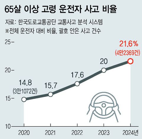 실제로 고령 운전자의 운전 미숙으로 추정되는 차량 돌진 사고는 최근 끊이지 않고 있다. 60대 운전자가 사상자를 낸 ‘시청역 참사’ 두달 뒤인 지난해 9월, 70대 운전자가 서울 강북구의 한 햄버거 가게로 돌진해 행인 1명이 숨지고 4명이 다쳤다. 지난해 12월 서울 양천구 목동깨비시장에 70대 운전자가 차량으로 돌진해 1명이 숨지고 12명이 다쳤다.