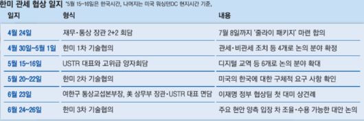 지난 4월부터 우리 정부는 미국과의 장관급 회담 등을 통해 협상 의제를 조율해왔지만 지난달 20~22일 열린 2차 실무협상(기술협의)에 이르러서야 미국의 구체적인 요구사항을 확인했다. 그마저도 대선과 새 정부 출범 등으로 논의를 진전시킬 충분한 시간을 갖지 못했다.