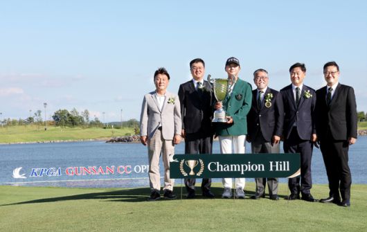 옥태훈이 한국프로골프(KPGA) 투어에서 2주 연속 우승을 달성했다. 옥태훈은 29일 전북 군산CC 토너먼트 코스(파72)에서 열린 KPGA 군산CC 오픈 최종 4라운드에서 4언더파 68타를 쳤다. 최종 합계 19언더파 269타를 기록한 옥태훈은 2위 이정환(17언더파 271타)을 2타 차로 따돌렸다. 22일 끝난 KPGA 선수권대회에서 KPGA 투어 첫 승을 신고했던 옥태훈은 2주 연속 우승을 달성했다. 옥태훈은 시즌 상금 8억 2307만 원, 제네시스 포인트는 4940.9점으로 모두 선두를 지켜냈다. 시상식 후 강임준(왼쪽부터) 군산시장, 김강학 군산CC 부회장, 옥태훈, 김원섭 KPGA 회장, 김관영 전북특별자치도 도지사, 김강호 군산CC 부회장이 기념 촬영을 하고 있다. 사진 제공=KPGA