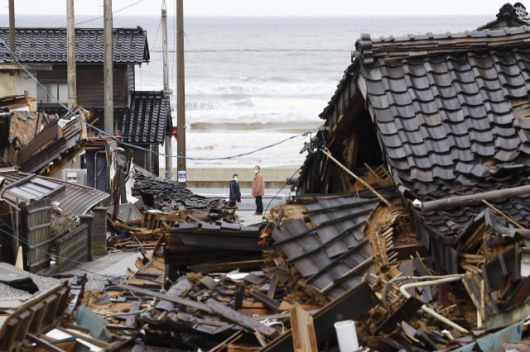 지난 2024년 1월 10일 일본 이시카와현 와지마 시내에서 주민들이 무너진 주택을 돌아보고 있다. 당시 새해 첫날 노토반도에서 발생한 규모 7.6의 강진으로 200명 이상이 사망했다. [사진출처 = 연합뉴스] |