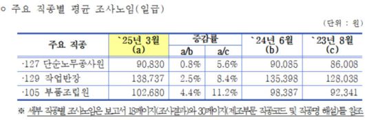 주요 직종별로 보면 단순노무종사원의 조사노임은 9만 830원으로 전년(9만85원) 대비 0.8% 올랐다. 작업반장(13만 5398원→13만 8737원)과 부품조립원(9만 8387원→10만 2680원)의 일급도 각각 2.5%, 4.4%씩 상승했다.