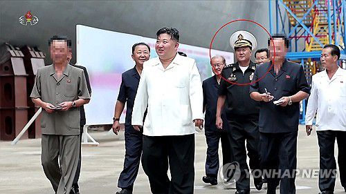 북한, 김정은 현지시찰 사진서 김명식 전 해군사령관 삭제 (서울=연합뉴스) 북한 조선중앙TV가 지난 13일 방영한 구축함 '강건호' 진수기념식 영상에서 김정은 국무위원장의 지난 3월 함선건조사업 현지시찰 사진(위)을 재공개하면서 당초 김 위원장과 함께 있던 김명식 전 해군사령관(아래)을 완전히 삭제한 채 편집해 내보냈다. 해군사령관은 김명식 대신 동해함대사령관이었던 박광섭(상장)으로 교체된 것으로 확인됐다. 2025.6.14 [국내에서만 사용가능. 재배포 금지. For Use Only in the Republic of Korea. No Redistribution] nkphoto@yna.co.kr |