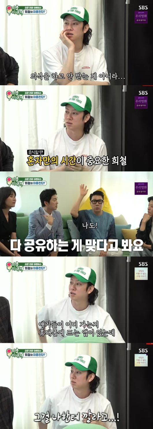 김희철은 "이런 사람은 있었다. 애기들 안전하게 어디가는지 뜨는 앱이 있는데 그걸 깔라고 하는 사람이 있었다"며 과거 여자친구를 언급했다.
