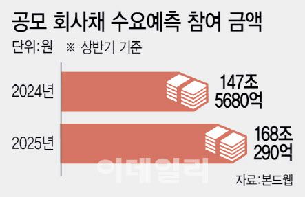 [이데일리 마켓in 김연서 기자] 올해 상반기 공모 회사채 수요예측에 참여한 자금 규모가 168조원을 넘어서면서 반기 기준 역대 최대를 기록했다. 홈플러스 기업회생 신청, 롯데손해보험 후순위채 콜옵션(조기상환권) 행사 불발 등 악재가 있었지만 우량채 위주로 돈이 몰리면서 역대급 활황을 보였다.