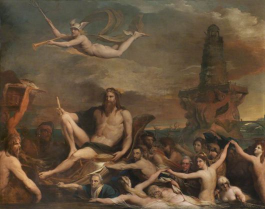 그림을 보면 한가운데 비스듬이 기대어 앉아 있는 인물이 ‘템스강의 신(Father Thames)’이다. 그는 오른손에 노를 잡고, 왼손에는 나침반을 들고 있다. 노가 항해를 상징한다면, 나침반은 이성을 상징한다. 템스강의 신 위에는 ‘상업의 신’ 머큐리가 자리한다. 이어 템스강의 신을 프랜시스 드레이크, 월터 롤리, 제임스 쿡 등 영국이 배출한 탐험가와 항해사들이 받들고 있다. 주변에는 ‘바다의 요정’ 네레이드도 배치돼 있다. 하나의 그림 속에 신화적 인물과 역사적으로 실재했던 인물이 함께 등장하고 있어 흥미롭다. 이는 자신들의 역사가 언제가 신격화되기를 기대하며 그렸다고 해석할 수 있다.