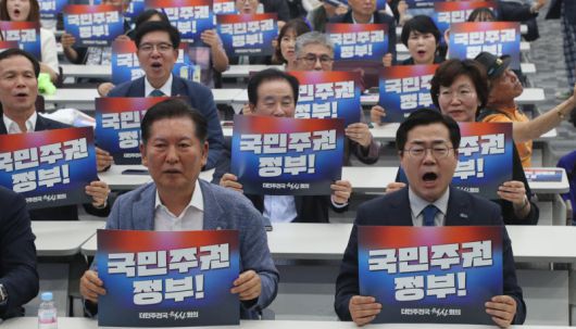 “국민주권 정부” 더불어민주당 대표로 나선 박찬대, 정청래 의원(앞줄 오른쪽부터)이 29일 오후 충북 청주시 오송읍 오스코에서 열린 ‘더민주전국혁신회의 전국대회’에 참석해 ‘국민주권 정부!’라고 적힌 피켓을 들고 있다. 민주당은 권역별 순회경선을 거쳐 8월 2일 경기 고양시 킨텍스에서 전당대회를 열 예정이다. 청주=뉴스1 |
