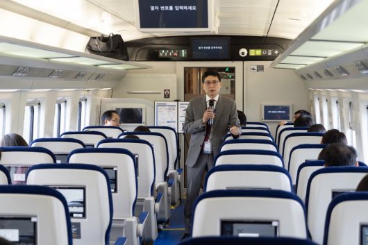 24일 열린 2세대 KTX-이음 시승회 현장. 객실에 서서 열차를 설명하는 김종훈 현대로템 레일솔루션 본부장의 목소리가 또렷하게 들렸다. 빠르게 스쳐 가는 창밖 풍경에서 상당한 속도감이 느껴졌지만, 객실 내부는 조용했다. 김 본부장이 마이크를 사용하긴 했지만, 큰 볼륨 없이도 서서 말하는 소리가 충분히 전달됐다.