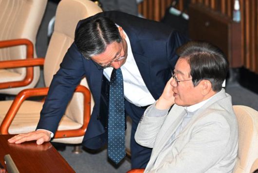 이재명 대통령이 더불어민주당 대표 시절인 지난 4월 14일 국회 본회의장에서 '친명계 좌장'이라 불리는 정성호 의원과 대화하고 있다. 고영권 기자 |