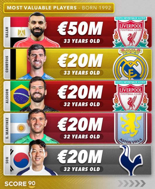 손흥민과 같은 1992년생 중에선 높은 편이다. 모하메드 살라가 5,000만 유로로 1위다. 에밀리아노 마르티네스, 티보 쿠르투아, 알리송 베커와 함께 2위에 올라있다. 공교롭게도 모두 골키퍼다. 그라니트 자카, 마르크-안드레 테어 슈테겐, 네이마르, 알바로 모라타, 마르셀로 브로조비치, 카세미루, 사디오 마네 등은 가뿐히 제친다.