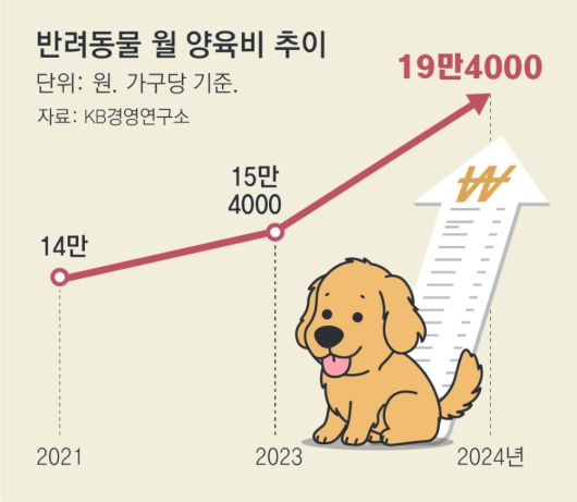KB금융지주 경영연구소가 29일 내놓은 ‘2025 한국반려동물’ 보고서에 따르면 반려인들이 매달 쓰는 양육비는 지난해 말 기준 월평균 19만4000원으로 집계됐다. 1년 전(15만4000원)보다 4만 원 증가한 수준이다. 반려견 가구와 반려묘 가구는 각각 월평균 17만8000원, 17만5000원을 지출했다.