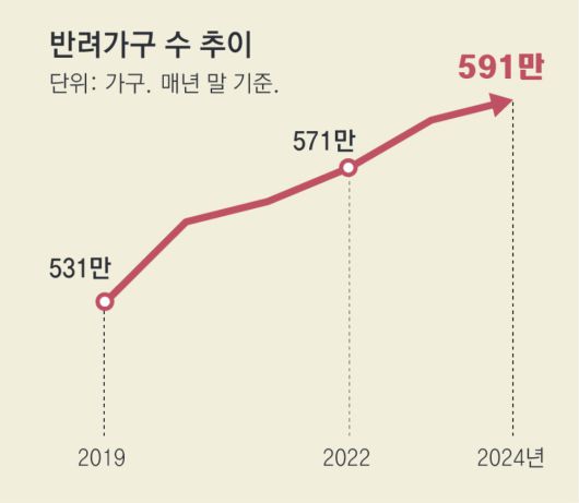 보고서는 반려동물을 키우는 가구 수를 약 591만 가구로 추산했다. 1년 전보다 6만 가구(1.1%) 늘어난 규모다. 반려동물을 키우는 사람 기준으로는 약 1546만 명으로 전체 인구의 29.9%를 차지했다. 사실상 대한민국 국민 10명 중 3명이 반려동물을 기르고 있다는 얘기다.