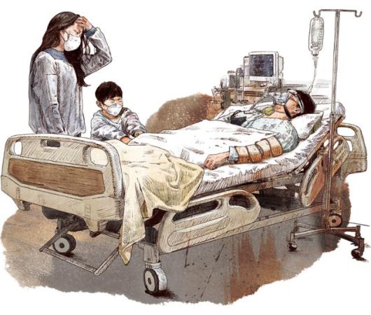 '존엄하게 죽고 싶다'는 우리의 바람은 이뤄질 수 있을까. 연명의료결정제가 올해로 시행 7년, 법 제정 기준으로는 내년이면 10년이 된다. 사전연명의료의향서 작성자 300만 돌파도 초읽기에 들어갔다. 그 사이 이별의 풍경은 또 어떻게 달라졌을까. 전국 의료 현장에서 확인하고 파악한 실상과 한계, 대안을 5회에 걸쳐 보도한다.중환자실에 있는 환자와 환자 가족의 모습. 일러스트=신동준 기자 |
