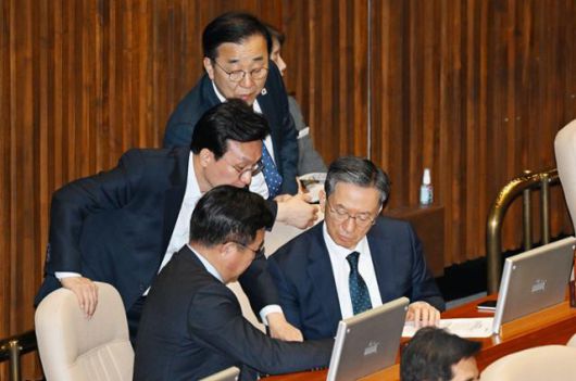 김민석(왼쪽 위부터 시계방향으로) 국무총리 후보자, 김윤덕 더불어민주당 사무총장, 정성호 법무부 장관 후보자, 윤호중 행정안전부 장관 후보자가 4월 14일 국회 본회의장에서 대화하고 있다. 고영권 기자 |