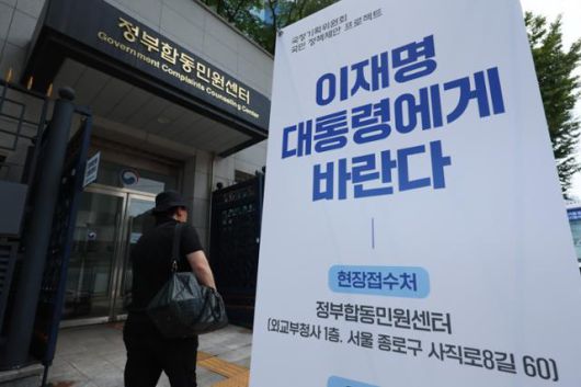 23일 서울 종로구 외교부 청사 1층 정부합동민원센터 앞에 국정기획위 국민정책제안 프로젝트 '이재명 대통령에게 바란다' 배너가 설치돼 있다. 연합뉴스 |