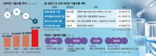 국내 바이오텍 기술 계약 중 플랫폼 기술이 차지하는 비중은 꾸준히 높아지고 있다. 전체 기술수출 중 플랫폼 기술이 차지하는 비중은 지난해 26%(4건), 2023년 20%(4건), 2022년 18%(3건)이다. 바이오업계 관계자는 “단일 후보물질과 달리 플랫폼 기술은 기술의 사용 권리를 사가는 것으로 여러 회사로 수출이 가능한 게 장점"이라며 "국내 플랫폼 기술이 정교화되며 글로벌 제약사들의 관심과 투자 규모도 커지고 있다”고 설명했다.
