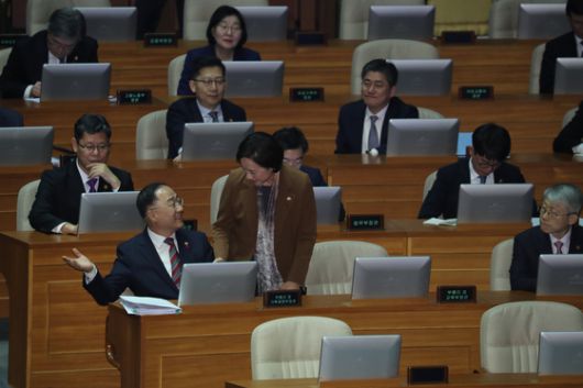 2019년 12월 10일 당시 홍남기 경제부총리 겸 기획재정부 장관이 국회 본회의장에서 자신의 의원석으로 가려고 일어선 유은혜 사회부총리 겸 교육부 장관과 대화하고 있다. 연합뉴스 |