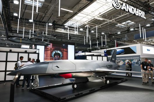 프랑스 파리 르 부르제 공항에서 19일 열린 제55회 파리 국제 에어쇼에서 방문객들이 안두릴의 전시 부스를 관람하고 있다.
