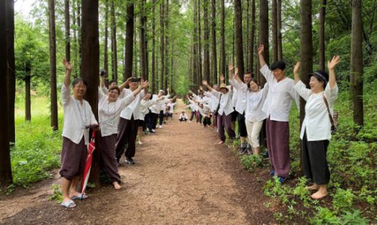 문화관광체육부와 한국관광공사로부터 힐링 명상분야 웰니스 관광지로 선정된 경북 영덕의 인문힐링센타 ‘여명’의 프로그램 중 하나인 숲길 걷기 모습. 영덕군 제공 |