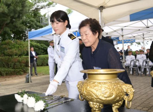 제2연평해전 당시 순직한 고 조천형 상사의 딸 조시은(왼쪽) 소위와 모친 임헌순 여사가 29일 경기 평택 해군제2함대사령부에서 거행된 제2연평해전 승전 23주년 기념행사에서 전승비에 헌화하고 있다. 2025.6.29 해군 제공 |