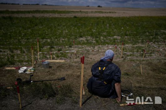 [키이우=AP/뉴시스] 우크라이나가 29일(현지 시간) 대인지뢰금지협약인 '오타와 협약'에서 탈퇴하는 절차를 개시했다. 사진은 비정부기구 지뢰 탐지 작업자가 2022년 6월 14일 우크라이나 키이우 외곽에서 대전차 및 대인 지뢰를 탐색하는 모습. 2025.06.30. |