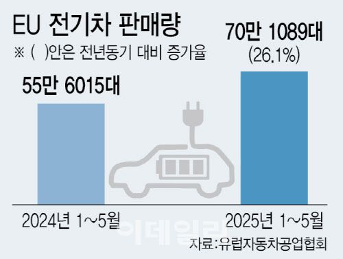 특히 유럽 시장 회복세가 눈에 띈다. 29일 유럽자동차공업협회(ACEA)에 따르면 지난달 유럽연합(EU) 내 배터리 전기차 판매량은 14만2776대로, 전년 동기(11만4231대) 대비 판매량이 25% 증가했다. 1~5월 전기차 누적 판매량도 70만대를 돌파하며 1년 전보다 26.1% 성장했다.