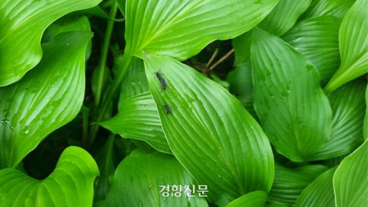 지난 25일 서울 양천구 한 아파트 단지 화단에 붉은등우단털파리(러브버그) 3마리가 잎 위에 앉아 있다. 강한들 기자 |