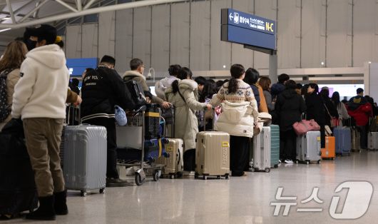 인천국제공항 1터미널 출국장에서 이용객들이 탑승수속을 위해 길게 줄 서 있다. 2025.1.23/뉴스1 ⓒ News1 이승배 기자 |