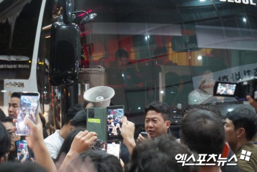 한동안 버스 안에서 머무르다 내려와 확성기 마이크를 잡은 김 감독은 팬들에게 "이번 일이 일어나게 된 것에 대해 정말 죄송스럽게 생각한다"며 "이틀 뒤 간담회를 통해 다 말씀드리도록 하겠다"고 했다.