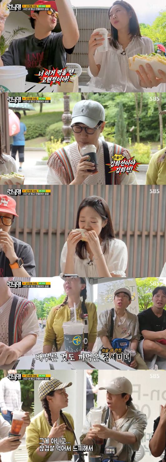 지석진 또한 "김희선이야 김희선"라며 지예은을 칭찬했고, 양세찬은 "진짜 잘 먹는다"라며 감탄했다. 이어 김종국은 "고소영이다. 고소영"이라며 또한번 지예은에 감탄했다.