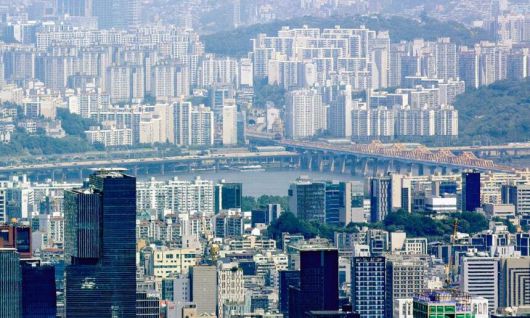 경기도 성남시 청계산 매바위에서 바라본 서울 강남구(아래)와 한강 이북 아파트 단지. 연합뉴스 |