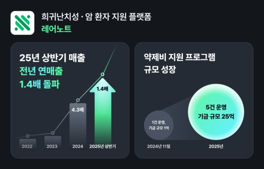 희귀질환 및 암 환자 전용 플랫폼 '레어노트(Rarenote)'가 2025년 상반기 실적만으로 2024년 연간 매출을 초과 달성했다. 2024년 연매출도 전년 대비 3.3배 증가하며 플랫폼의 성장성과 시장 수요를 입증했다.